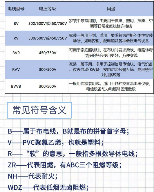 家里装修时都会用到电线,也会看到常用电线型号有BV、BVR、RV、BVVB、RVV,